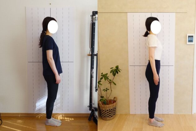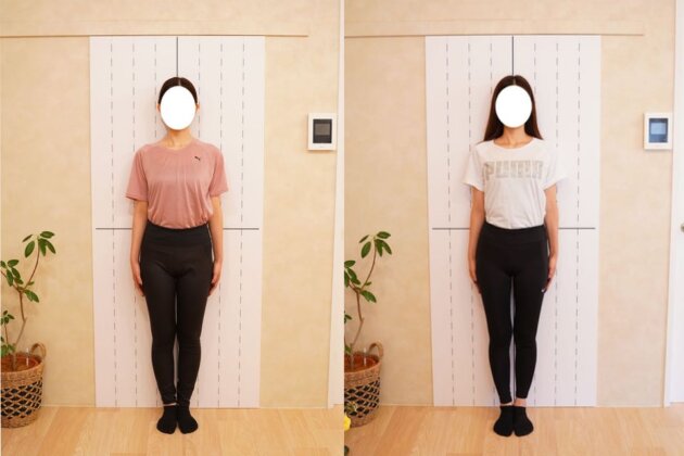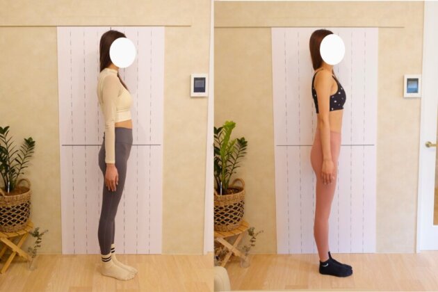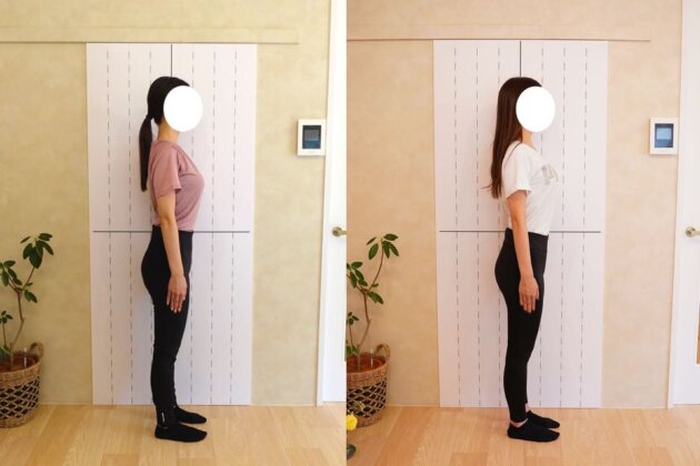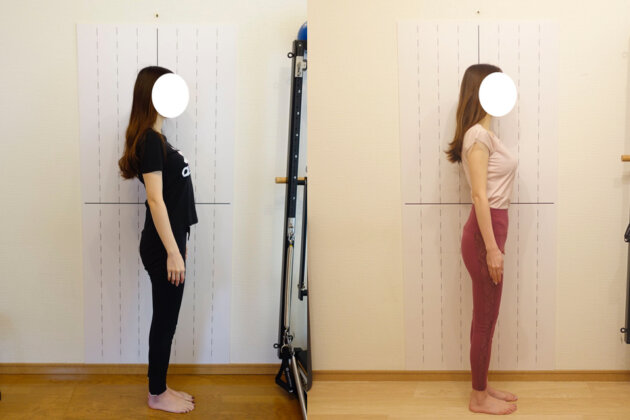 希望に応じてレッスン前後の撮影を行なって姿勢の比較をしたり、生徒さまが姿勢を意識できるタッチポイントを増やす取り組みを行なっています。(画像:before→after)