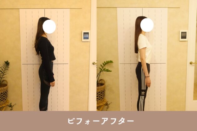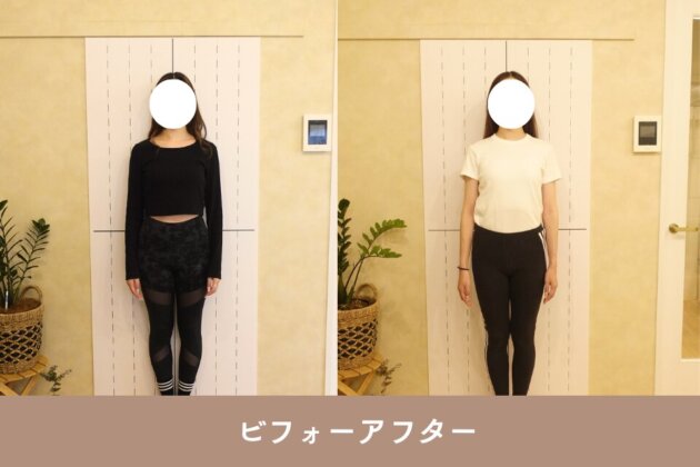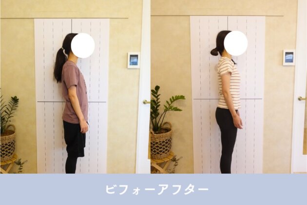 希望に応じてレッスン前後の撮影を行なって姿勢の比較をしたり、生徒さまが姿勢を意識できるタッチポイントを増やす取り組みを行なっています。(画像:before→after)